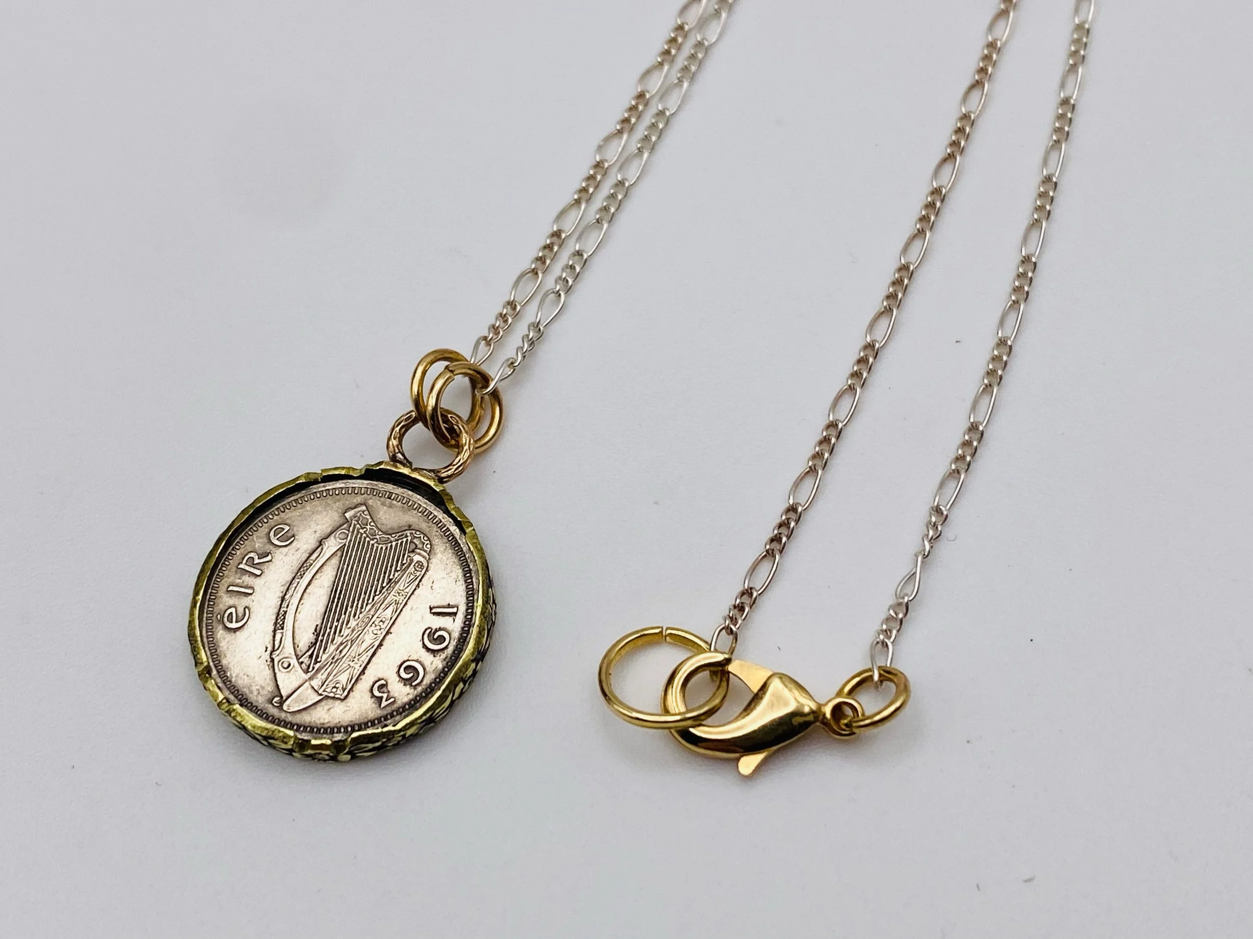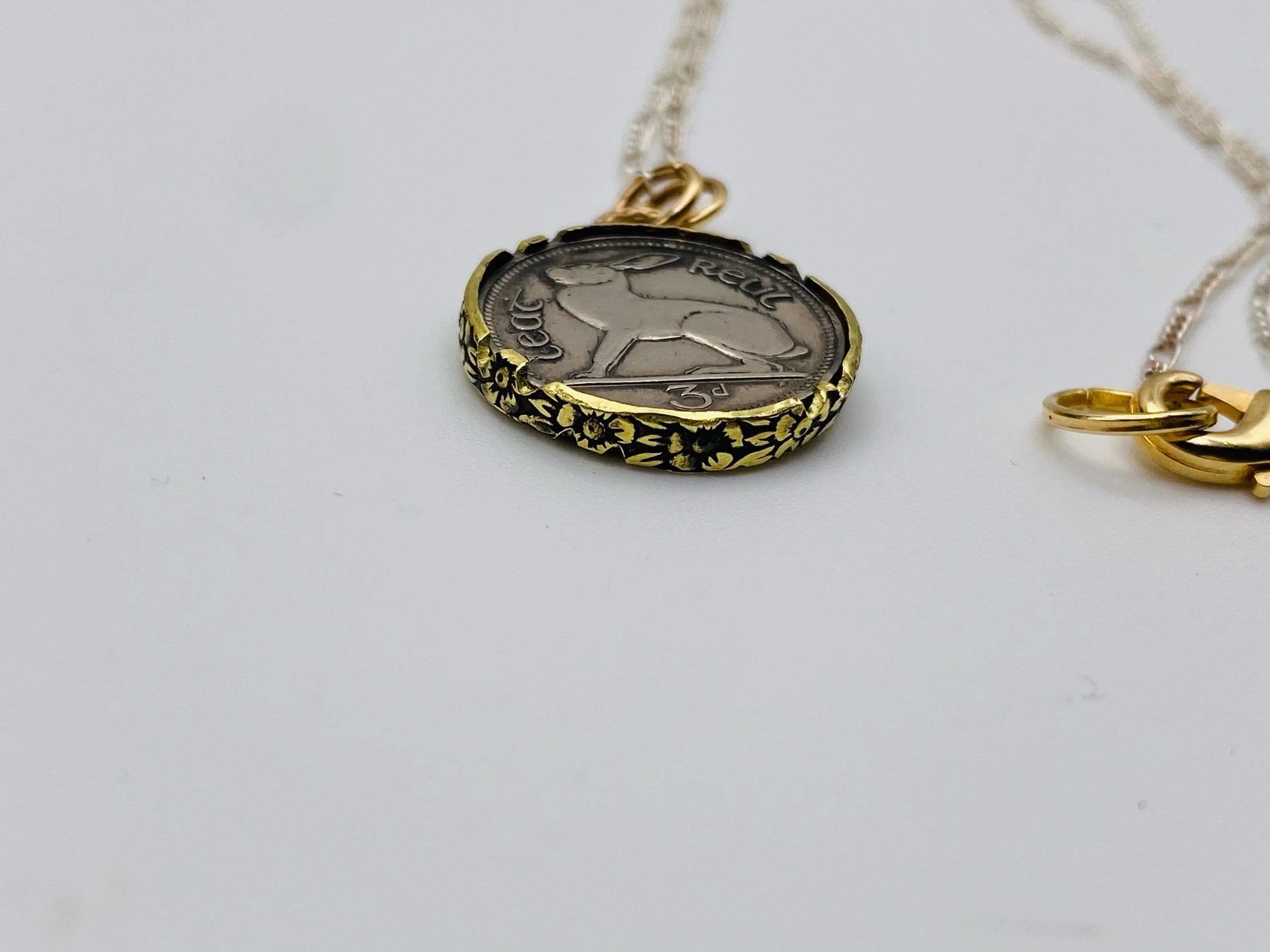 Crafted from an Irish 3 pence coin that can be worn with either side showing, the brass border features a floral design, and the pendant is on a 19” sterling silver figaro chain with a traditional brass lobster clasp.